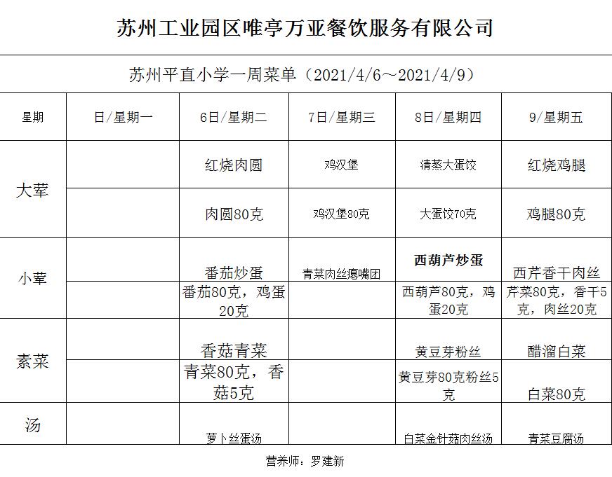 学校2020~2021学年度第二学期第6周菜单