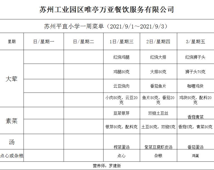 学校2021~2022学年度第一学期第1周菜单