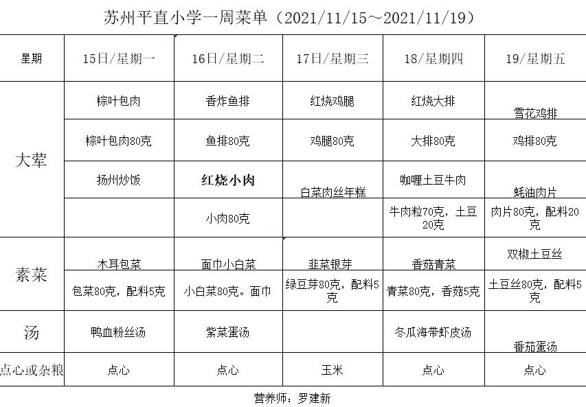 学校2021~2022学年度第一学期第11周菜单