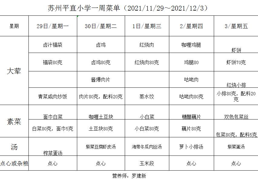 学校2021~2022学年度第一学期第14周菜单