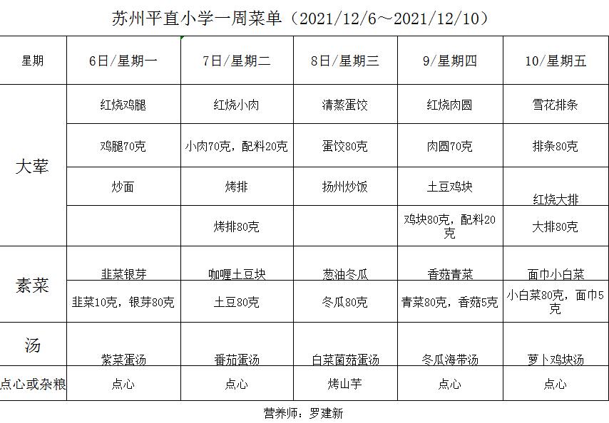 学校2021~2022学年度第一学期第14周菜单