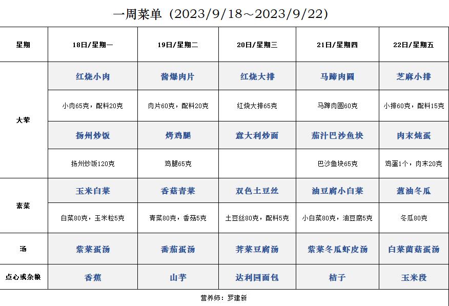 一周菜单(2023/9/18~2023/9/22)