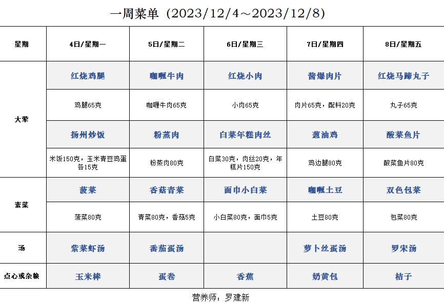 一周菜单(2023/12/4~2023/12/8)