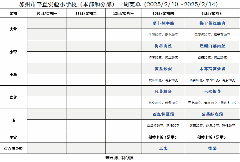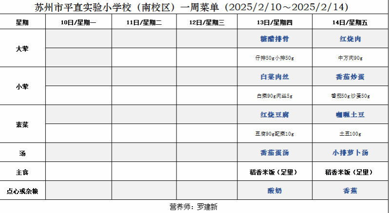 一周菜单(2025/2/10~2025/2/14)