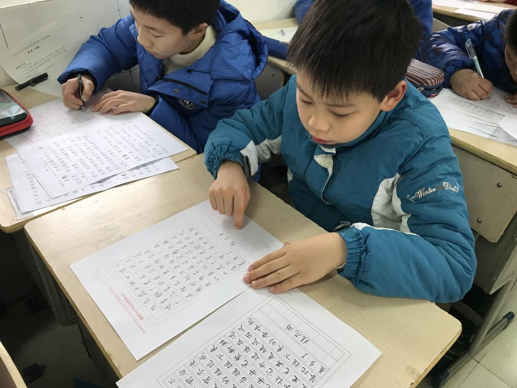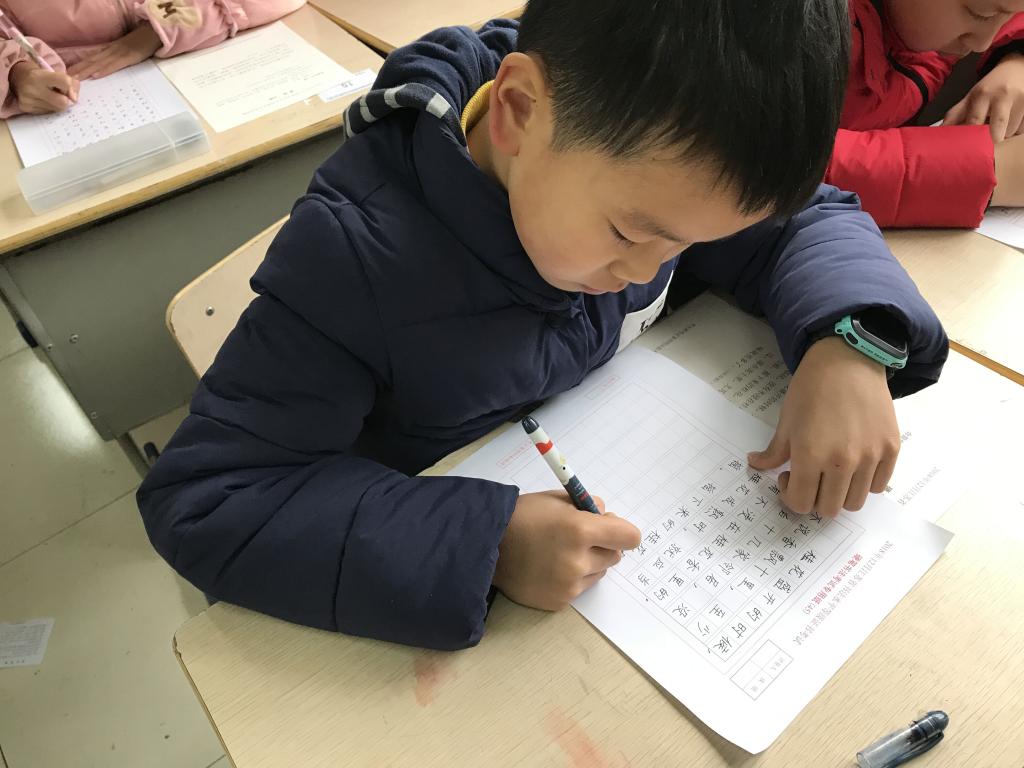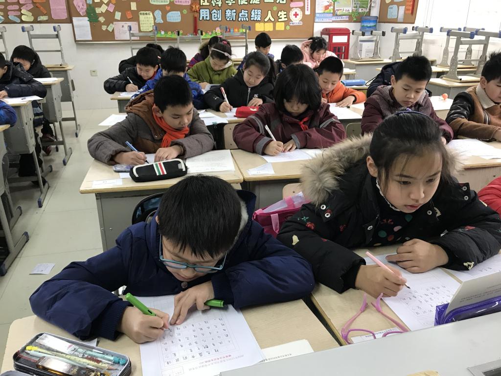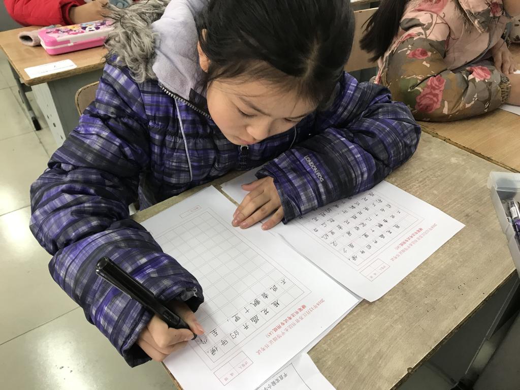 9点开始,监考老师准时开始分发考卷,还有部分老师组织同学们进行搓手,跳跃活动,让同学们先热身一下再参加考级书写。同学们在考场上,不怕寒冷,边搓小手,边哈热气,聚精会神,一丝不苟地书写每一个字。正如学校大屏书写的“端端正正写字,堂堂正正做人”。