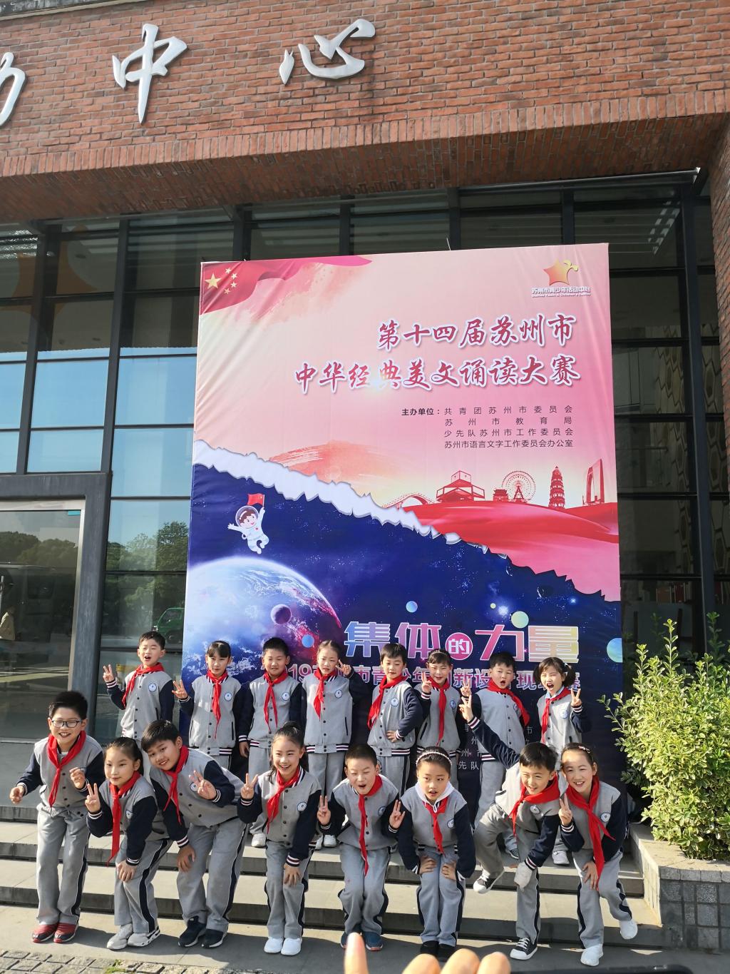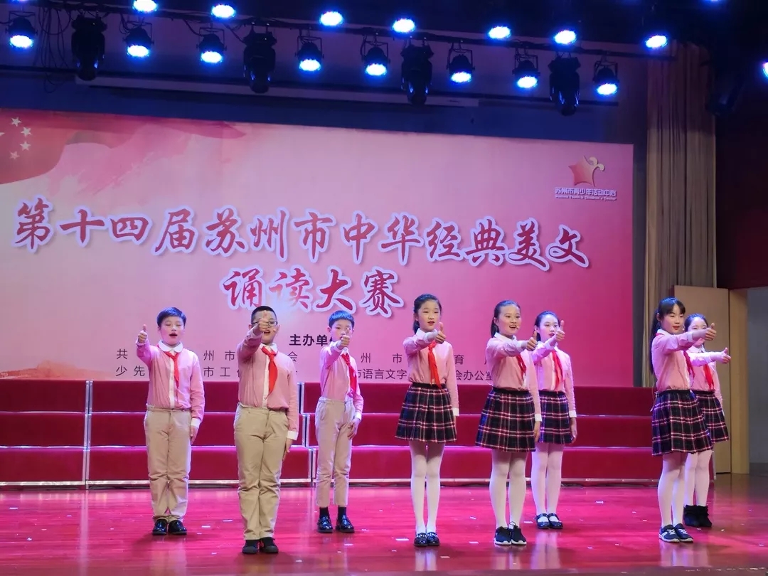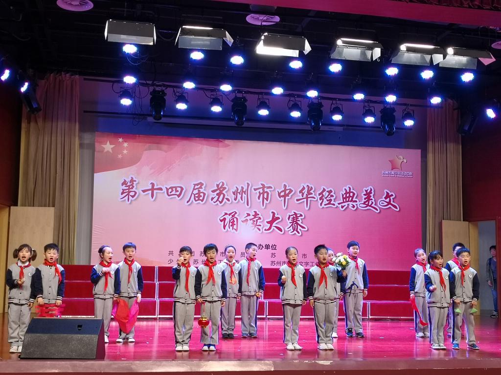 为了深入培育和践行社会主义核心价值观,大力弘扬中华优秀传统文化,4月18日,由共青团苏州市委员会、苏州市教育局、少先队苏州市工作委员会和苏州市语言文字工作委员会办公室共同主办的第十四届苏州市中华经典美文诵读大赛在苏州市青少年活动中心举行。经过各年级的选拔,我校二年级代表队和五年级代表队参与了此次活动。