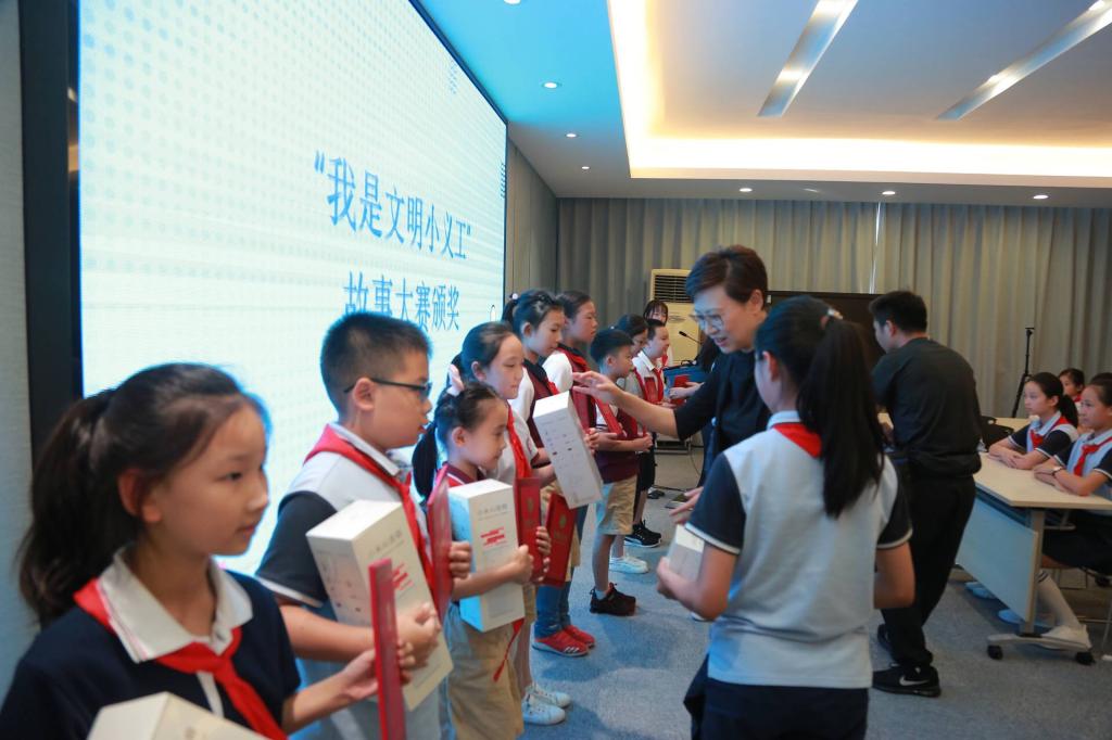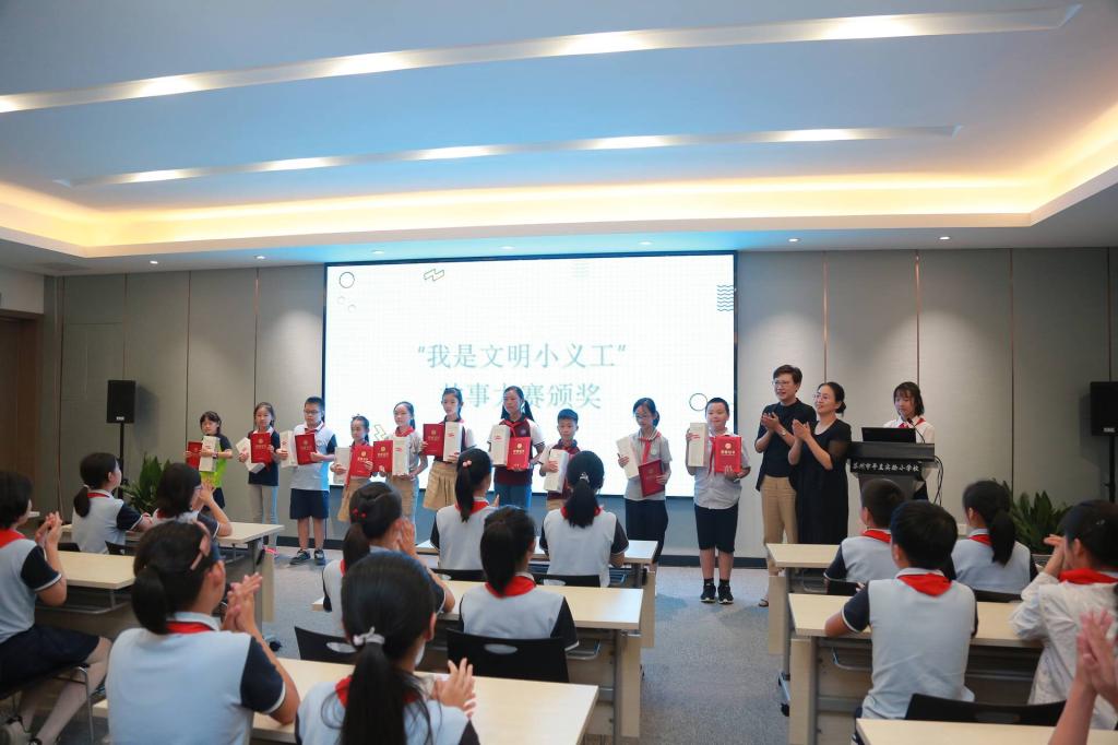 • 启动仪式上,姑苏区委宣传部副部长、文明办主任张英姿和姑苏区教育体育和文化旅游委员会副主任谢芳为第二届“稚”爱古城“我是文明小义工”线上故事大赛10位获奖学生颁发奖状和纪念品。我校周锐杰同学在暑假期间积极参与了古城保护、文明礼仪、垃圾分类等各类志愿服务活动,讲述了“我是文明小义工”的故事,经过激烈的角逐获此殊荣。