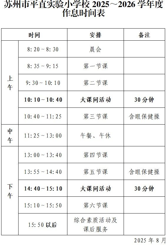 2025-2026学年度作息时间表