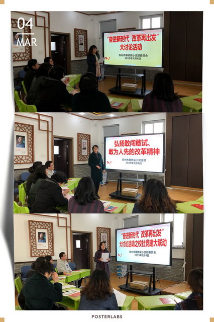本次大讨论活动中,各支部紧紧围绕“奋进新时代,改革再出发”这一主题,结合苏州改革开放40年发展历程,深刻认识和把握改革开放是当代中国的“关键抉择”“活力之源”“重要法宝”,是“正确之路”“强国之路”“富民之路”,进一步坚定改革开放再出发的决心和信心;深刻认识和把握与时俱进弘扬以改革创新为核心的时代精神的重大现实意义,勇于打破思维定势、行为惯性和路径依赖,更加善于研判形势主动采取措施,善于结合实际创新方式方法,努力推动工作实现突破性进展;紧密联系当前基层学校工作实际、基层党建工作实际、党员思想实际、师生家长生活实际,立足新时代,学习新思想,深入研讨基层党员干部勇担新使命、实现新作为应有的责任担当、精神风貌和务实作风,用思想自觉和行动自觉为改革开放再出发作出积极贡献,全体党员教师进行了激昂、热烈、富有实效的大讨论。大家踊跃发言,各抒己见,整个活动紧扣主题,务实高效。