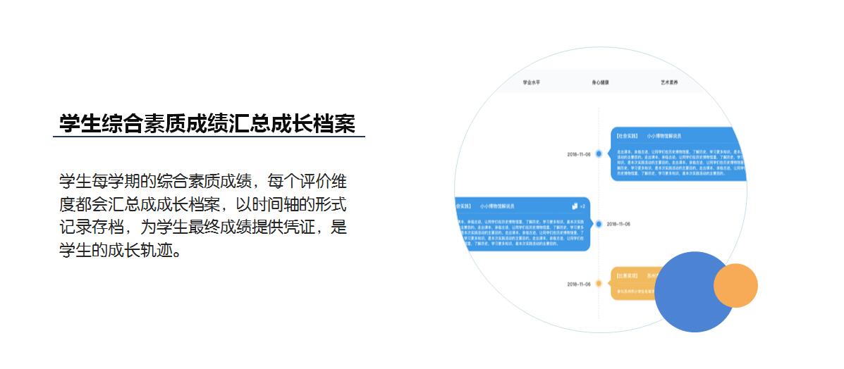 3.学生综合素质成绩汇总成长档案。每个学期,该系统都将根据记录信息为每个学生生成一份综合素质评价档案。每个评价维度都会汇总成成长档案,以时间轴的形式记录存档,为学生最终成绩提供凭证,是学生的成长轨迹。
